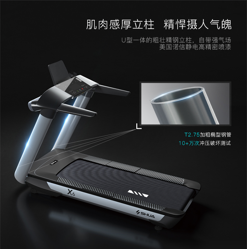 KY开元888推荐健身器材-舒华商用电动跑步机SH-T6500拥有10.1寸IPS高清触摸屏、Z型动感时尚外观设计、70×150mm精钢立柱机身、F级高效静音马达、520mm商用豪华跑带和35mm双层全跑台减震跑板等优势,让您享受科学跑步。